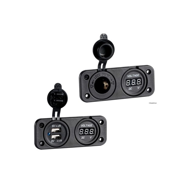 Πρίζα τροφοδοσίας 12V πάνελ με ενσωματωμένο βολτόμετρο, σχεδιασμένη για σταθερή εγκατάσταση σε πίνακα ή επίπεδη επιφάνεια του σκάφους.