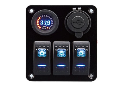 Περιλαμβάνει τρεις φωτιζόμενους διακόπτες τύπου rocker και στρογγυλή μονάδα USB με καπάκι προστασίας. Το βολτόμετρο επιτρέπει γρήγορο έλεγχο της τάσης μπαταρίας. Η πρόσοψη είναι ανθεκτική σε πιτσιλιές και ταιριάζει σε κονσόλες τιμονιού ή καμπίνας.