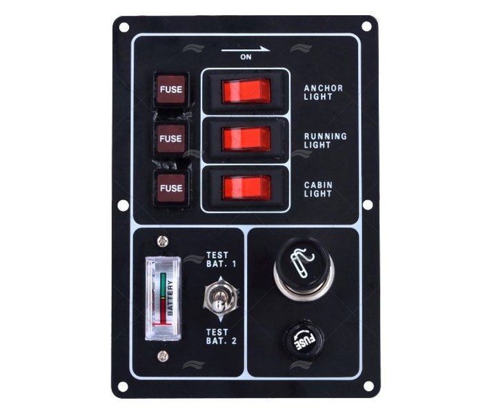 Συγκεντρώνει βασικά κυκλώματα φωτισμού σε μία στιβαρή πρόσοψη, με φωτιζόμενους διακόπτες και προστασία μέσω ασφαλειών. Η ένδειξη μπαταρίας επιτρέπει γρήγορο οπτικό έλεγχο φόρτισης, ενώ η πρίζα 12 V δίνει τροφοδοσία σε βοηθητικές συσκευές.