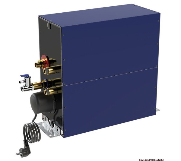 Παραλληλόγραμμος θερμοσίφωνας σκαφών ATI σειρά B χωρητικότητας 20 λίτρων, με διπλή λειτουργία — θερμαίνει το νερό μέσω του κυκλώματος ψύξης της μηχανής ή μέσω ηλεκτρικής αντίστασης 1250 W / 230 V (προαιρετικά 110 V για ΗΠΑ).