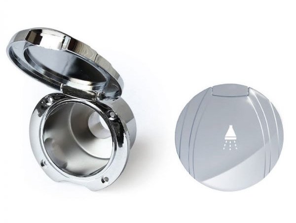 Χρωμιωμένη θήκη ντους με καπάκι, κατάλληλη για εντοιχισμό σε κατάστρωμα ή κάθετη επιφάνεια, για την προστασία και απόκρυψη της παροχής/κεφαλής ντους.