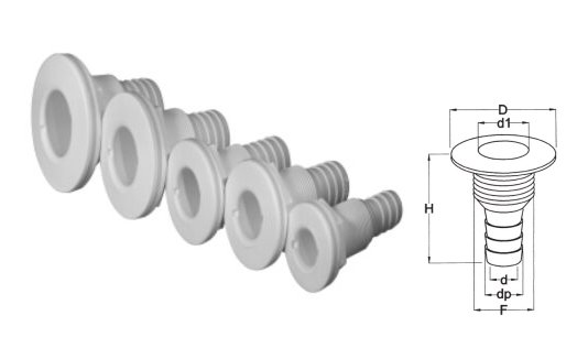 Πλαστική υδρορροή καταστρώματος με φλάντζα και ρακόρ για σύνδεση σωλήνα αποστράγγισης, κατάλληλη για κατάστρωμα ή κοκπιτ σκαφών.