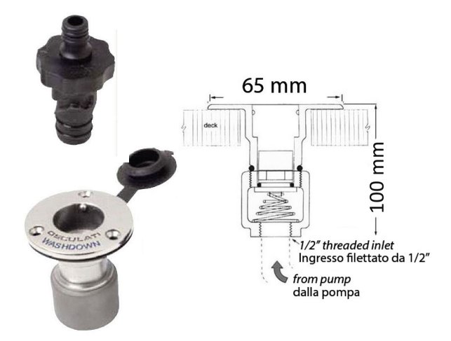 Όταν συνδεθεί το λάστιχο στον bayonet ταχυσύνδεσμο, η βαλβίδα ανοίγει αυτόματα και τροφοδοτεί την αντλία/γραμμή νερού. Η επάνω φλάντζα inox βιδώνει στο κατάστρωμα και το καπάκι με λάστιχο προστατεύει από είσοδο νερού ή βρωμιάς όταν ο σύνδεσμος δεν χρησιμοποιείται. Στο κάτω μέρος υπάρχει υποδοχή τύπου “garden” για γρήγορη σύνδεση της σωλήνας νερού.