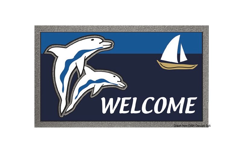 Ορθογώνιο χαλάκι εισόδου σκαφών με στάμπα WELCOME ON BOARD, παράσταση δελφινιών και ιστιοφόρου σε navy φόντο.