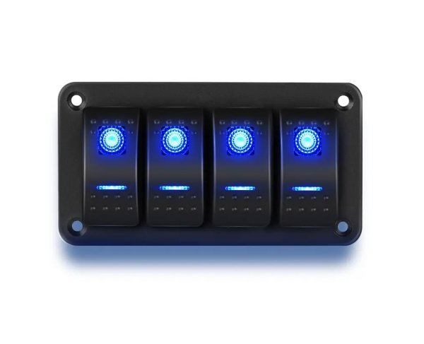 Πίνακας 4 φωτιζόμενων διακοπτών 12/24V με μπλε LED, ανθεκτική κατασκευή ABS/metal και ενσωματωμένη ασφάλεια Fuse. Ιδανικός για ηλεκτρολογικές εγκαταστάσεις σκαφών.