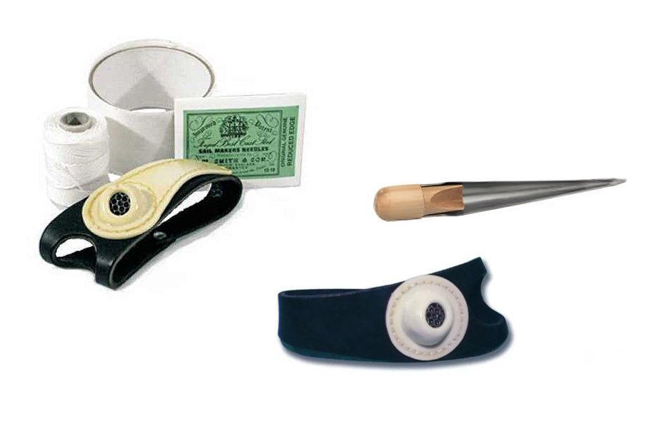 - Προστατευτικό παλάμης (sewing palm): εργαλείο που φοριέται στο χέρι για ώθηση της βελόνας σε χοντρά υφάσματα και καραβόπανα.