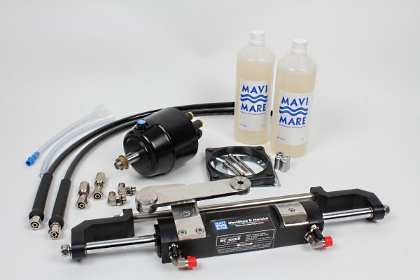 Πλήρες κιτ υδραυλικού τιμονιού για εξωλέμβιες έως 300HP (front-mount). Περιλαμβάνει αντλία τιμονιού (helm), κύλινδρο “bullhorn”, ρακόρ, λάδι υδραυλικού και σωλήνες προδιαγραφής SAE100 R7.