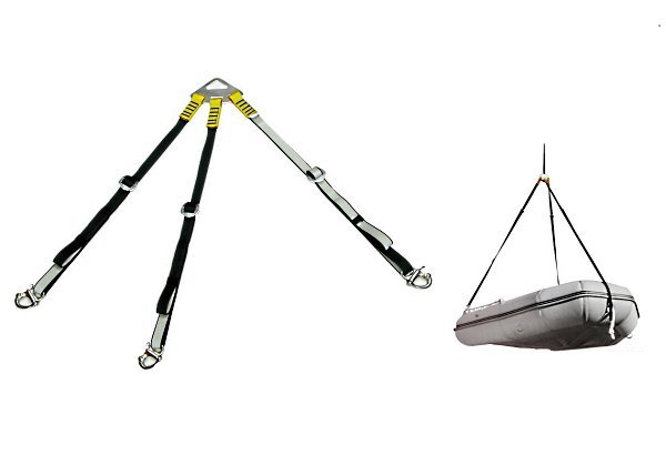 Αποτελείται από τρεις ρυθμιζόμενους ιμάντες από ανθεκτικό υλικό με αντιUV προστασία, ώστε να προσαρμόζεται σε διαφορετικές διατάξεις κρίκων/ματιών στο φουσκωτό. Στο επάνω μέρος υπάρχει πλάκα ανάρτησης από ανοδιωμένο αλουμίνιο, ενώ στα άκρα των ιμάντων υπάρχουν καραμπίνερ AISI 316 με ταχεία σύσφιξη για ασφαλή πρόσδεση. Το σετ είναι πιστοποιημένο και κατάλληλο για ανύψωση από γερανάκι, davits ή παπαγάλο.