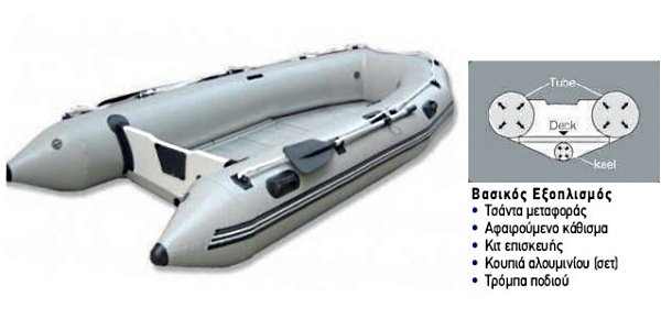 Φουσκωτή βάρκα (inflatable dinghy) με φουσκωτή γάστρα τύπου V για καλύτερο ίχνος και κατευθυντικότητα, διαθέσιμη με air floor ή aluminium floor και σε πολλαπλά μήκη.