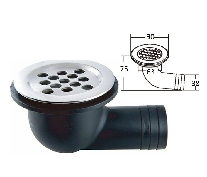 Υδρορροή αποχέτευσης με καπάκι από ανοξείδωτο ατσάλι και γωνιακό σώμα PVC 90°, κατάλληλη για απομάκρυνση νερού από το κατάστρωμα ή το cockpit του σκάφους.