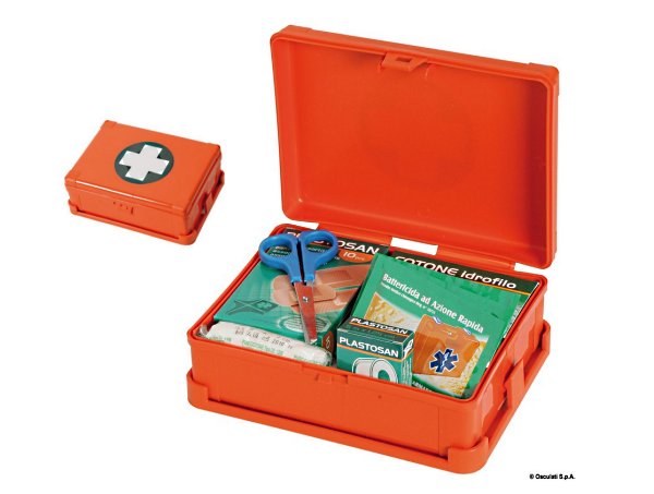 Ιταλικό φαρμακείο πρώτων βοηθειών με βάση στήριξης, σύμφωνα με τις απαιτήσεις για ναυσιπλοΐα έως 12 μίλια. Ιδανικό για μικρά και μεσαία σκάφη, με περιεχόμενο 11 ειδών σε ανθεκτική πλαστική κασετίνα διαστάσεων 13×18×7 cm.
