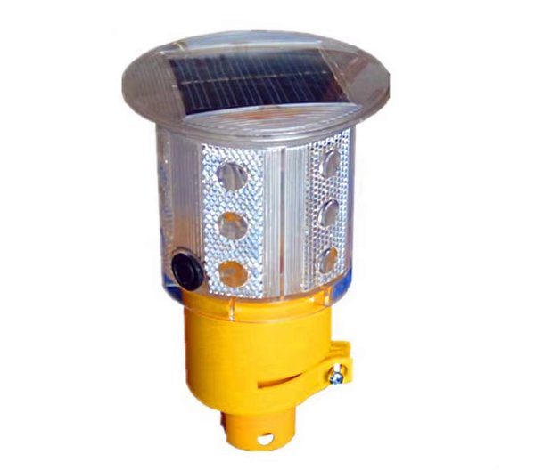 Φάρος αναλαμπών τύπου κωνικής κεφαλής LED με ενσωματωμένο φωτοβολταϊκό πάνελ στην κορυφή.