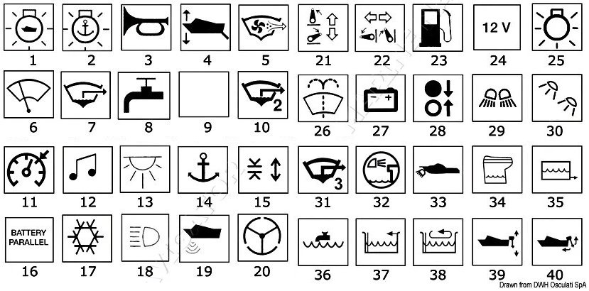 Σετ αυτοκόλλητων συμβόλων για θαλάσσιους διακόπτες και πίνακες, με 40 ευδιάκριτα εικονίδια για γρήγορη αναγνώριση λειτουργιών (π.χ. φώτα πορείας, άγκυρα, αντλία σεντίνας, υαλοκαθαριστήρες, κόρνα, καύσιμο, 12V κ.ά.).