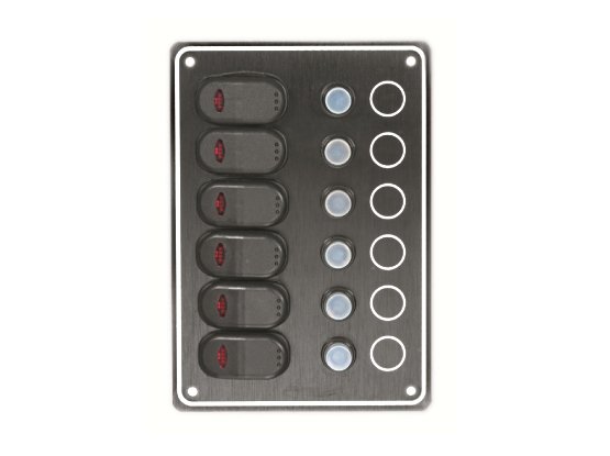 Πίνακας σκάφους 5 ή 6 θέσεων με διακόπτες LED και αυτόματες ασφάλειες (resettable breakers), ιδανικός για ηλεκτρικά κυκλώματα DC σε θαλάσσιο περιβάλλον.