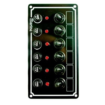 Marine switch panel με ενδεικτικά LED για έλεγχο ηλεκτρικών κυκλωμάτων σε σκάφη. Με εμπρόσθια όψη 100 mm πλάτος και στρογγυλούς διακόπτες με προστατευτικά καλύμματα.