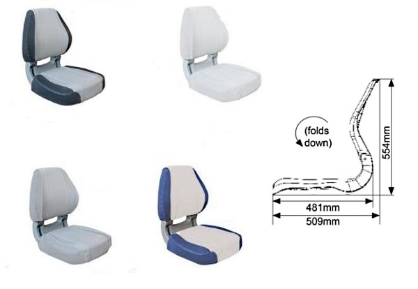 Διαθέτει μαξιλάρια αφρού θαλάσσης με επικάλυψη από ανθεκτικό marine ύφασμα, που καθαρίζεται εύκολα και αντέχει στον ήλιο. Η πλάτη αναδιπλώνεται προς τα εμπρός ώστε το κάθισμα να μην ενοχλεί όταν δεν χρησιμοποιείται. Συμβατό με τυπικές βάσεις/κολόνες καθισμάτων σκάφους.