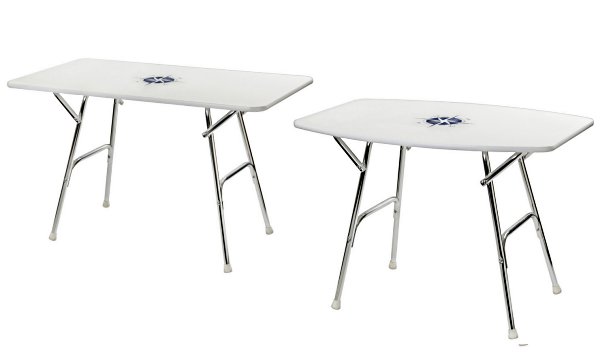 Τραπέζι αλουμινίου OSCULATI αναδιπλούμενο, σε δύο τύπους: ορθογώνιο 110×60 cm και οβάλ 95×66 cm. Ανοδιωμένη βάση, λευκή επιφάνεια 16 mm, ιδανικό για χρήση σε σκάφη.