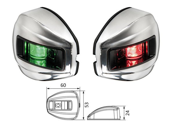 Το σετ περιλαμβάνει κόκκινο φανό (port) και πράσινο φανό (starboard) γωνίας 112,5° έκαστος, κατάλληλους για τοποθέτηση στην πλώρη. Οι φανάρια είναι εγκεκριμένα από RINA, συμμορφώνονται με COLREG72 και προσφέρουν ορατότητα έως 2 NM. Η σχεδίαση επιτρέπει εύκολη εγκατάσταση τόσο σε κάθετη όσο και σε οριζόντια επιφάνεια (ανά έκδοση).