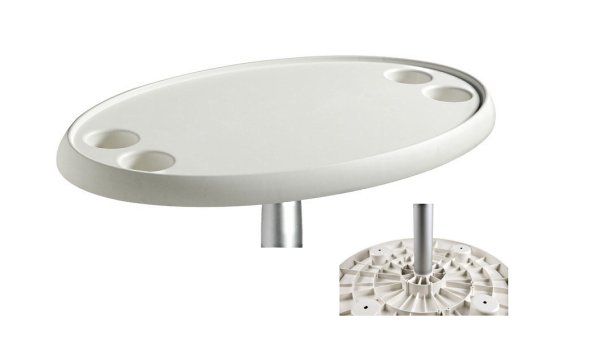 Οβάλ τραπέζι σκάφους 76×46 cm από σύνθετο υλικό με τέσσερις θήκες ποτηριών. Λευκή επιφάνεια, ελαφρύ και ανθεκτικό, κατάλληλο για εύκολη τοποθέτηση σε σκάφη.