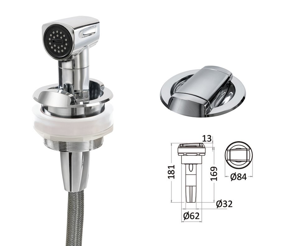 Ντους καταστρώματος Osculati Saturn με ενσωματωμένο μίκτη ζεστού και κρύου νερού, σχεδιασμένο για κάθετη τοποθέτηση σε καταστρώματα ή πλατφόρμες σκαφών. Ο μίκτης είναι πλήρως ενσωματωμένος κάτω από το καπάκι, προσφέροντας καθαρή αισθητική και προστασία από το νερό.
