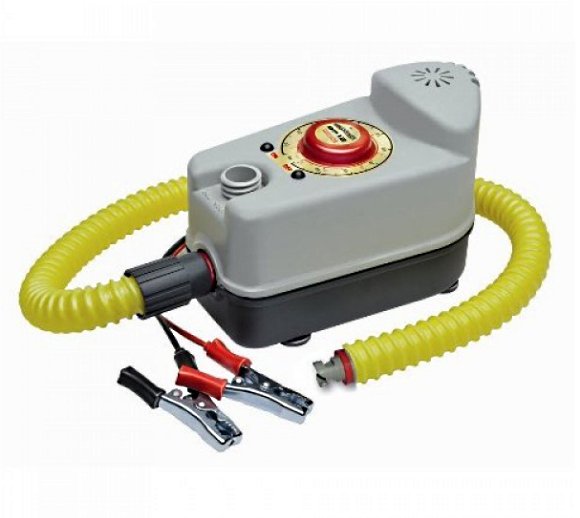 Συνδέεται απευθείας στη μπαταρία του σκάφους με κροκοδειλάκια, διαθέτει ρυθμιζόμενη πίεση και αυτόματη διακοπή όταν φτάσει στην επιλεγμένη τιμή, ώστε να αποφεύγεται το υπερφούσκωμα.