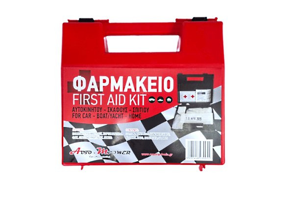 Φορητό φαρμακείο πρώτων βοηθειών σε πλαστική κασετίνα, διαθέσιμο σε δύο μεγέθη για χρήση σε αυτοκίνητο, σκάφος, μοτοσικλέτα ή σπίτι.
