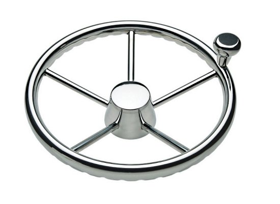 Τιμόνι σκαφών από ανοξείδωτο ατσάλι (INOX) με οδηγό/κουμπί χειρισμού για εύκολη περιστροφή. Κατάλληλο για εξωλέμβια και εσωλέμβια σκάφη, προσφέροντας ανθεκτικότητα και ακρίβεια στον χειρισμό.