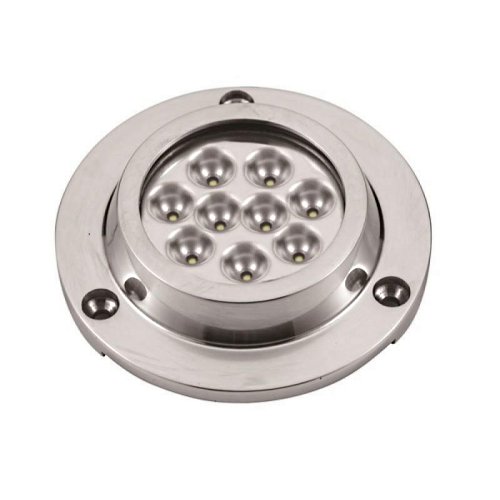 Στρογγυλό υποβρύχιο LED φωτιστικό με INOX πρόσοψη Ø90 mm, ισχύ 9×3 W και τροφοδοσία 10–30 V DC, διαθέσιμο σε λευκό ή μπλε φως.