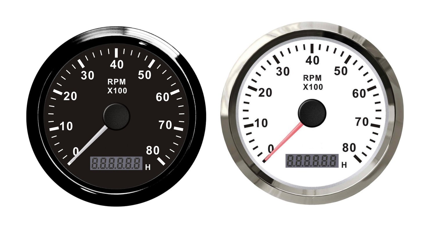 Διατίθεται με λευκό ή μαύρο καντράν και με δύο κλίμακες επιλογής: 0–4000 RPM ή 0–8000 RPM. Η πρόσοψη διαθέτει γυαλιστερό ανοξείδωτο στεφάνι, κυρτό διαφανές αντιθολωτικό κρύσταλλο και στεγανότητα IP67 στην εμπρόσθια πλευρά. Το ψηφιακό ωρόμετρο καταγράφει τις ώρες λειτουργίας του κινητήρα με ακρίβεια, σε συστήματα 12V ή 24V.