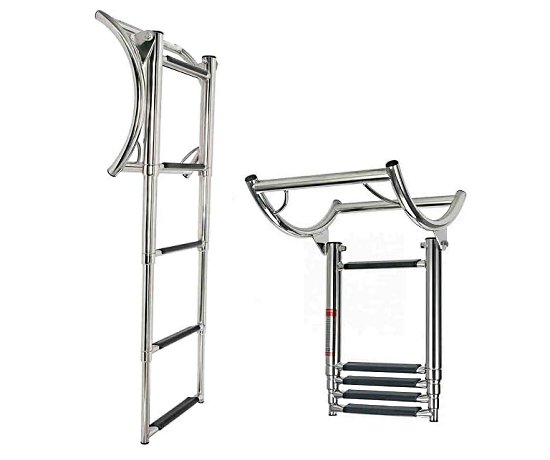 Κατασκευή από ανοξείδωτο AISI 316 με αντιολισθητικά σκαλοπάτια και καμπύλα μπρακέτα που «αγκαλιάζουν» τον αεροθάλαμο. Η επαφή με το tube προστατεύεται από rubber pads, ενώ η τηλεσκοπική διάταξη επιτρέπει γρήγορη ανάπτυξη και ασφαλή επιβίβαση/αποβίβαση από το νερό.