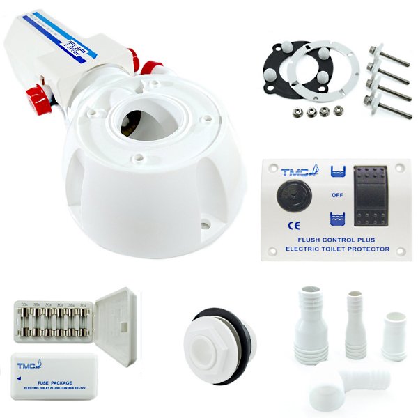 Το κιτ περιλαμβάνει αντλία macerator, βάση τουαλέτας, πλήκτρο ή πάνελ ελέγχου και όλα τα απαραίτητα εξαρτήματα σωληνώσεων και συνδέσεων. Διατίθεται σε εκδόσεις 12 V και 24 V, συμβατό με ηλεκτρικά μοντέλα TMC καθώς και με ορισμένα Five Oceans.