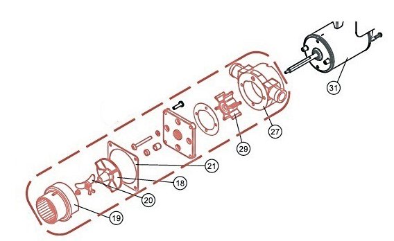 Πλήρες ανταλλακτικό κιτ για αντλία τουαλέτας σκαφών που περιλαμβάνει το ιμπέλερ, τη φλάντζα στεγανοποίησης και το σώμα/κάλυμμα της αντλίας.