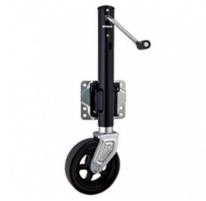 Η στιβαρή κατασκευή του με γαλβανιζέ σωλήνα και ανθεκτική μαύρη ρόδα επιτρέπει την ομαλή κύλιση και εύκολη ανύψωση/καθίζηση μέσω της χειρολαβής περιστροφής. Το ροδάκι διαθέτει πλάκα στήριξης με σφιγκτήρα για γρήγορη τοποθέτηση στη γλώσσα του τρέιλερ.