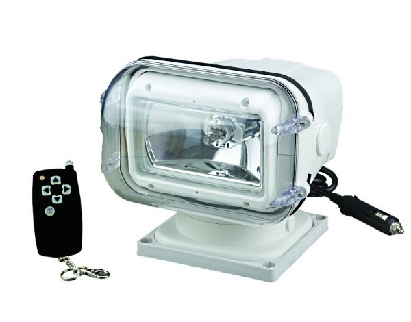 Αδιάβροχος ασύρματος προβολέας 12V/50W για σκάφη. Ισχυρή δέσμη, τηλεχειρισμός περιστροφής/κλίσης και εύκολη τροφοδοσία με φις αναπτήρα για ασφαλή νυχτερινή πλοήγηση.